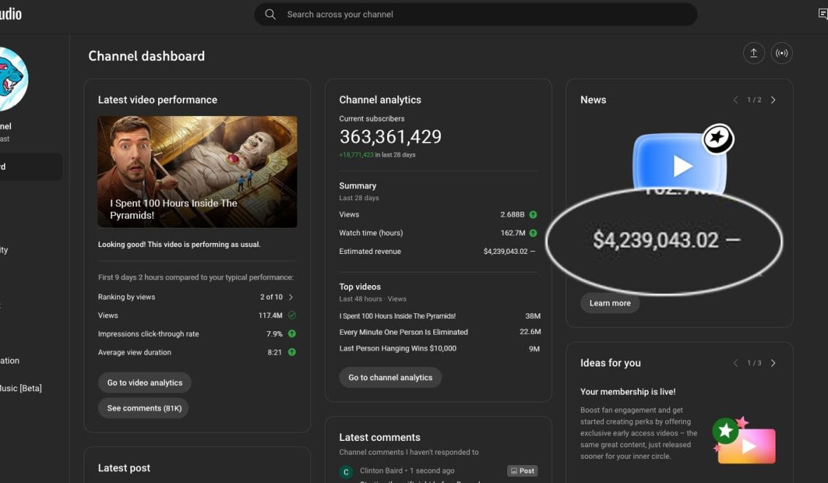 Njegov poslovni model, ki združuje zabavo, dobrodelnost in podjetništvo, predstavlja prihodnost digitalne zabavne industrije. Glede na trenutni trend rasti lahko pričakujemo, da bo MrBeast v prihodnosti še presegel svoje trenutne finančne dosežke in še naprej navdihoval ustvarjalce vsebin po vsem svetu.MrBeast, s pravim imenom Jimmy Donaldson, velja za najbolj priljubljenega ustvarjalca na YouTubu. Njegov kanal spremlja kar 364 milijonov ljudi z vsega sveta. S svojimi viralnimi videoposnetki, ki pogosto vključujejo nenavadne izzive in igre z visokimi denarnimi nagradami, je postal prava spletna senzacija. Vendar pa se mnogi sprašujejo, koliko v resnici zasluži od svojega uspeha.
